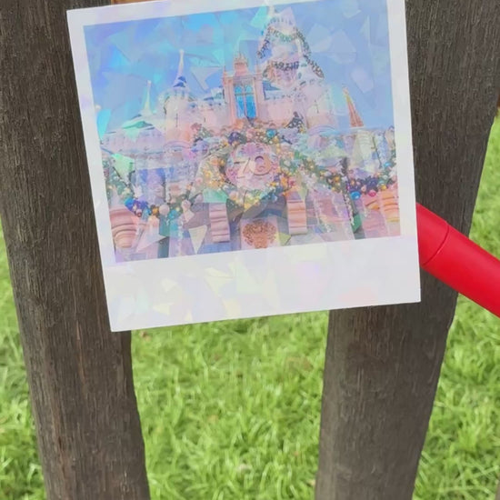 Celebrate the holidays at Disneyland with this set of 2 die cut stickers! These are edited to look like a vintage Polaroid / instant film style and feature Sleeping Beauty's castle and It's a Small World decked out in their holiday flair. They have a shatter glass glitter overlay for extra shine and fun (please see reference video). These are water resistant with the glitter overlay but I would be careful with washing them or putting them in the dishwasher.