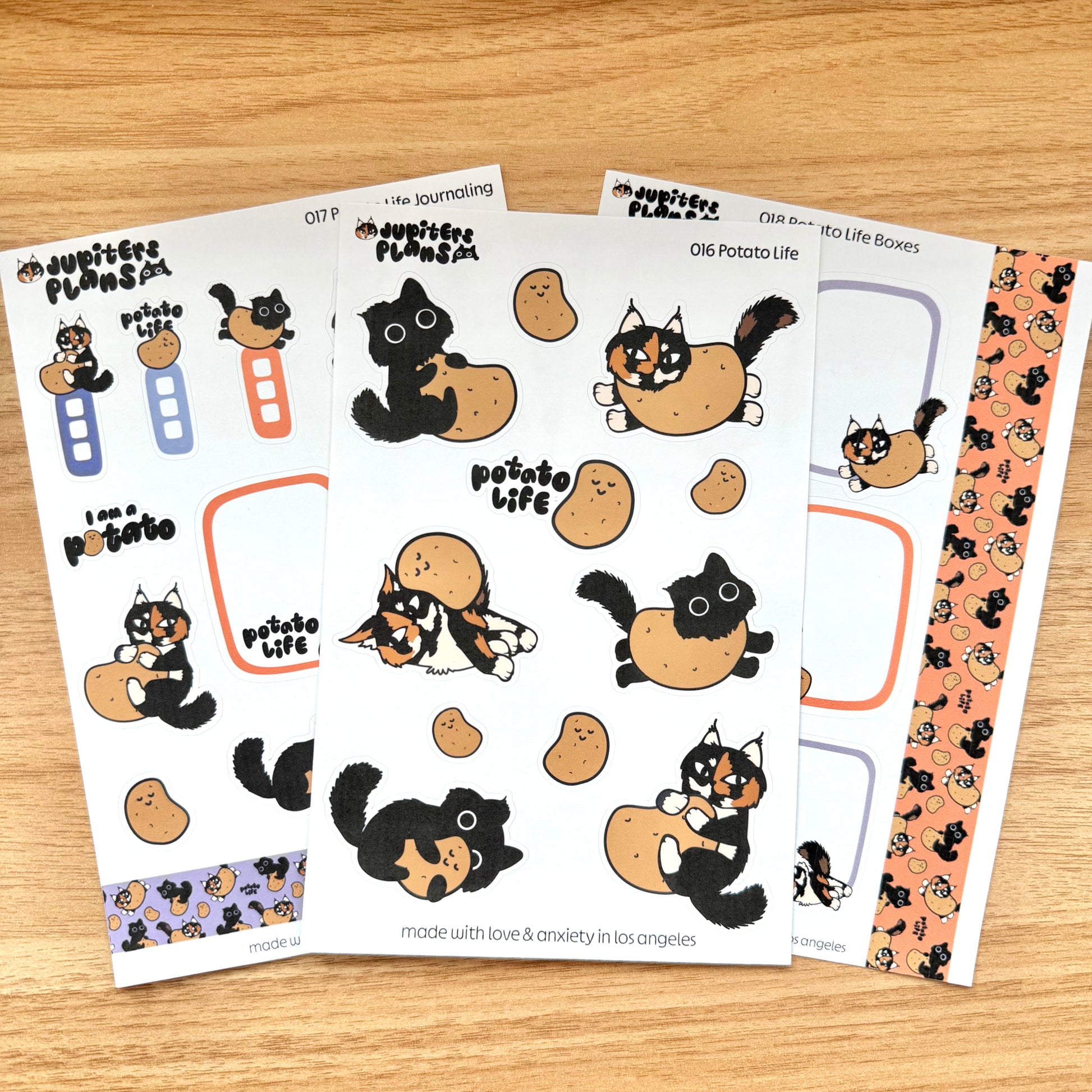 Introducing the I'm a Potato collection! Your favorite kitties, Jupiter and Midnight, are here to celebrate fall and Thanksgiving in the way they know how - potating. This journaling sticker sheet has washi strip, boxes, checklists and deco cat stickers. These are a super silly way to bring a smile to your face during the week in the your planners!